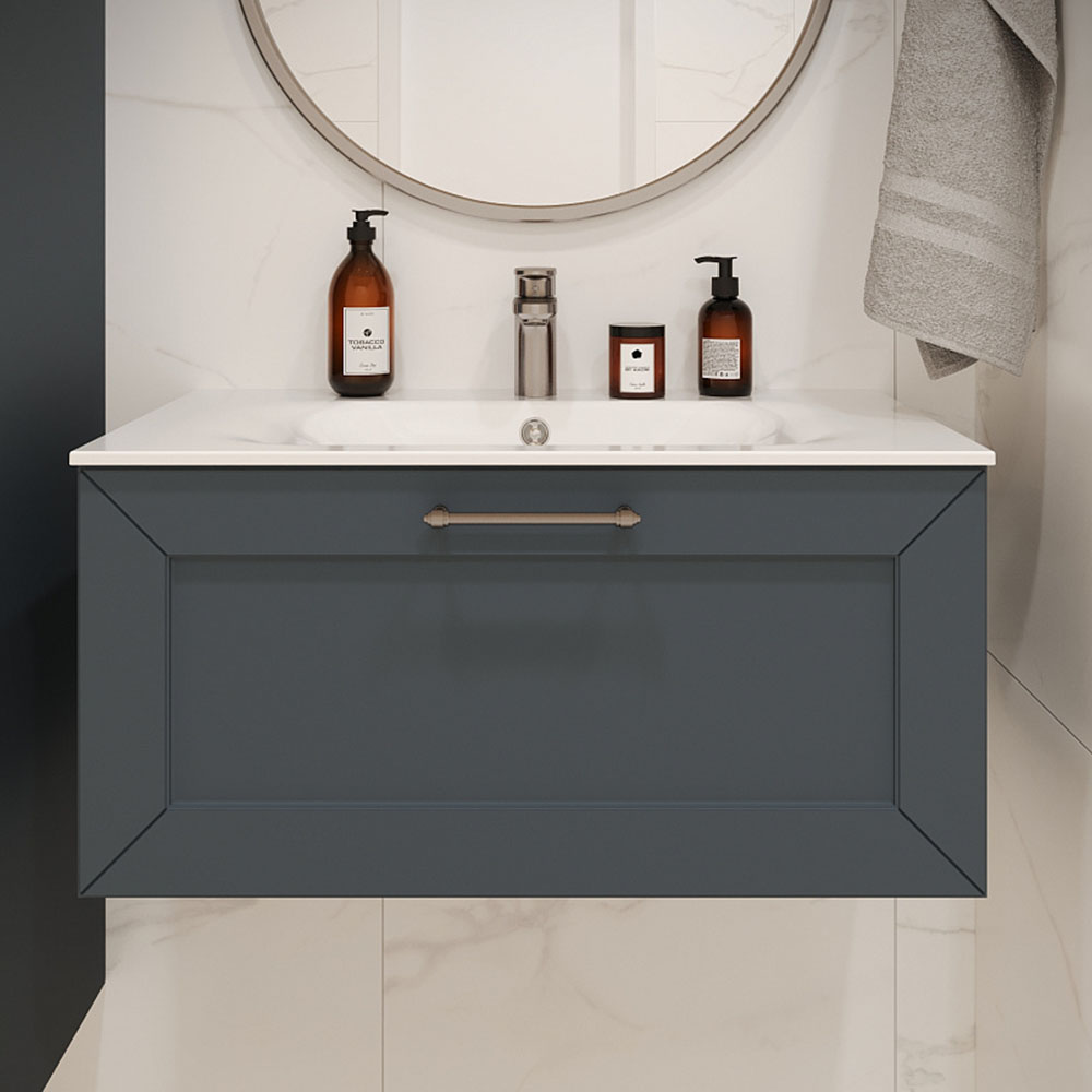 Тумба с раковиной подвесная (80см) Terminus Victoria VIC10801703101O, серый шёлк. Раковина из литьевого мрамора в комплекте: диаметр отверстия под смеситель: 35, диаметр отверстия слива: 45 мм, диаметр отверстия перелива: 30 мм. Ширина тумбы: 800 мм. Тип фасада: Филенчатая фрезеровка . Материал ящиков: ДСП. Количество ящиков: 1. Сифон и данный клапан приобретаются отдельно и в комплект поставки не входят. В тумбе установлена фурнитура Firmax. Система открывания: Металлические ручки . Технология направляющих: Soft-Close, полного выдвижения, с доводчиком. Тумба поставляется в сборе. Гарантийный срок 2 года.