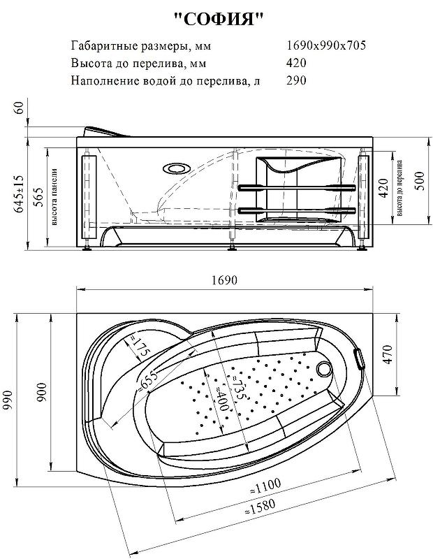 | Оснащение | С панелью (экраном), с каркасом, с полотенцедержателем, со сливом-переливом |