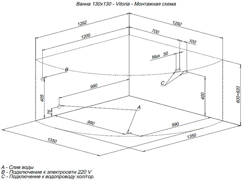 Закажите товар "Акриловая ванна Aquanet Vitoria 130×130 205371 без гидромассажа"