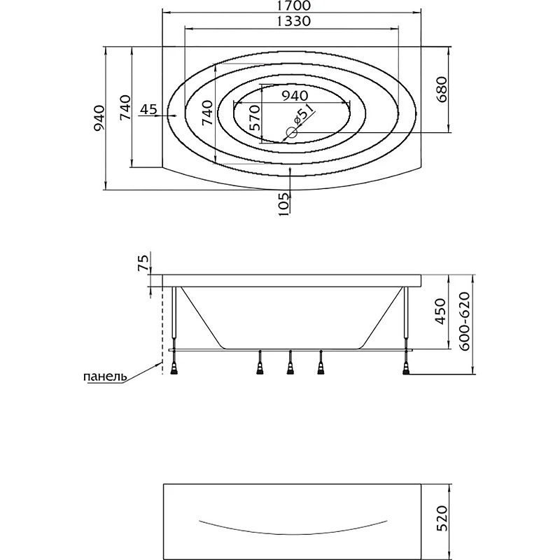 Закажите товар "Акриловая ванна Marka One Nega 170х95 01нег1795 без гидромассажа"
