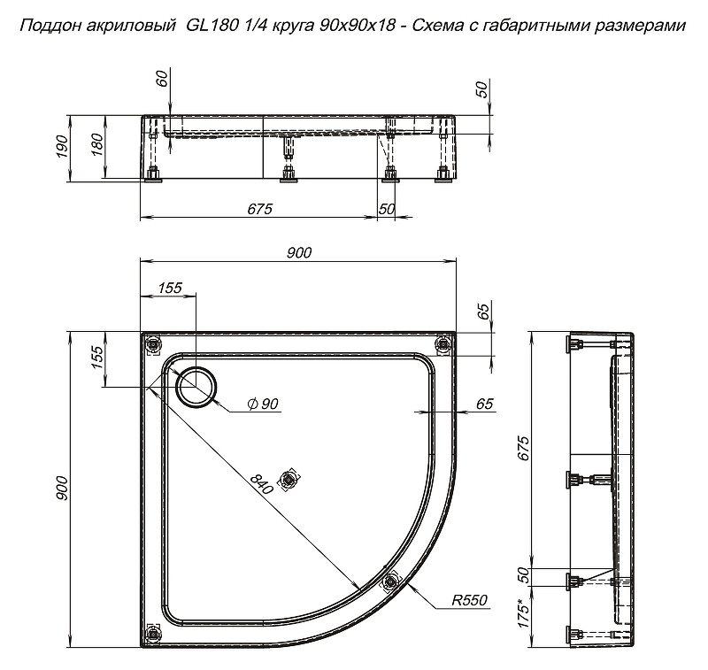 Уголовой акриловый поддон для душа Aquanet GL180 90x90 265571 выполнен из акрила.