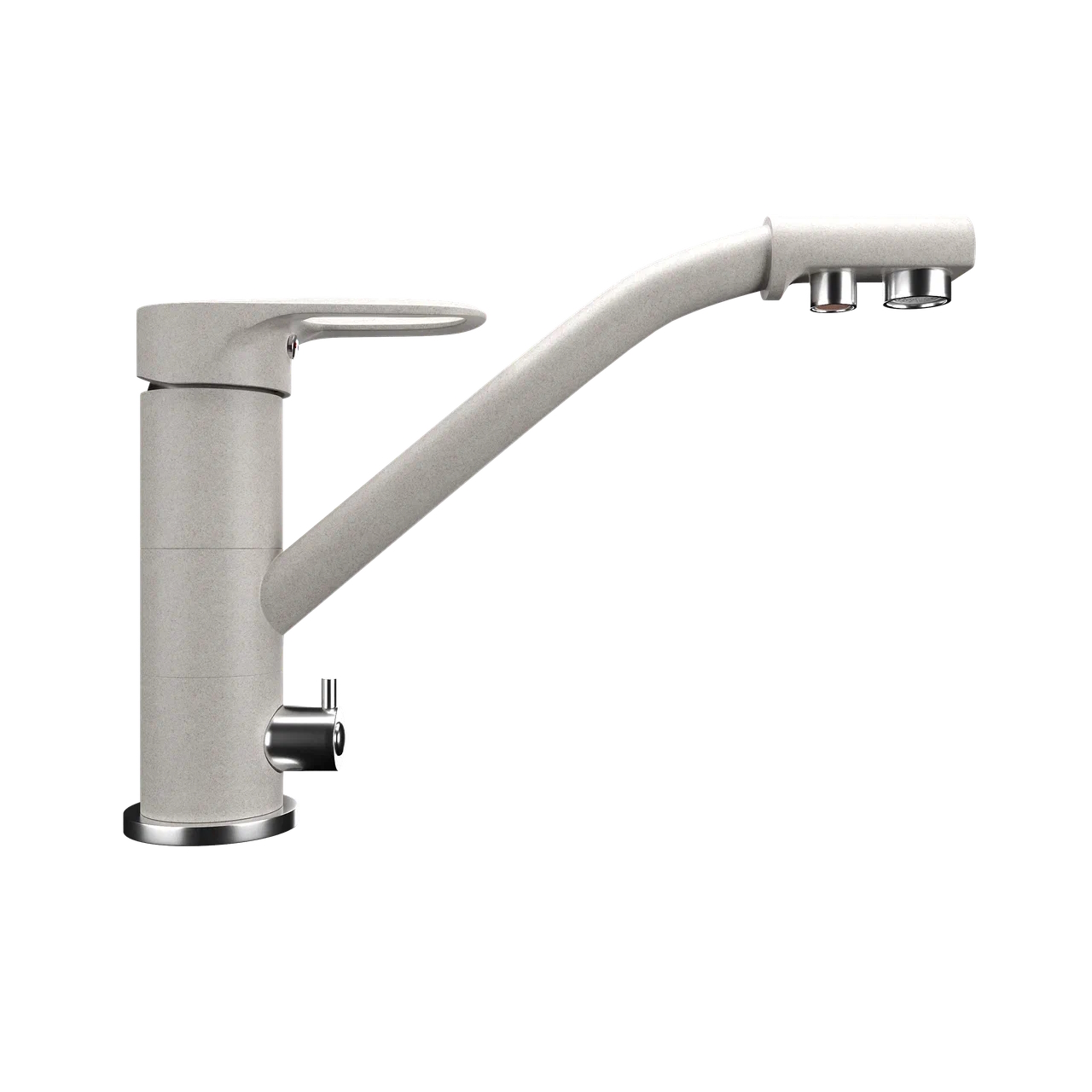 ULGRAN Quartz UQ-010 - высокоэргономичный кухонный смеситель с дополнительным краном для подключения фильтрованной воды, оснащенный кран-буксой с керамическими пластинами. Реализован тройной подвод воды через один излив: холодная, горячая и фильтрованная. Переход с одного подвода на другой производится поворотом рычага. Набор для соединения с фильтром входит в комплект . Система фильтрации приобретается дополнительно и монтируется под мойку, специальный индикатор сообщает о необходимости замены картриджа. Материал корпуса выполнен из высококачественной латуни, а окрашивание под "искусственный камень" в цвет мойки ULGRAN Quartz выполняется на собственном производстве, что позволяет идеально попасть в фирменный цвет ULGRAN Quart. В качестве керамического картриджа используется известный бренд Wanhai диаметром 35 мм с высокой пропускной способностью в 500 тысяч циклов "открывания-закрывания".  На подвижные части картриджа  Wanhai  нанесена специальная невымываемая силиконовая смазка, а керамические пластины изготовлены из 96% оксида алюминия, что, в сочетании с высоким качеством шлифовки обеспечивает долговечность, надежность, плавность хода рукоятки.  Смеситель оборудован съемным пластиковым аэратором для экономии воды  и поворотным изливом на 360 градусов. В комплектацию входя:  керамический картридж  Wanhai, гибкая подводка, комплект крепежных элементов,  кран-букса с керамическими пластинами для дополнительного излива для фильтрованной воды, набор для подсоединения фильтра питьевой воды (гибкая подводка + переходник-цанга), технический паспорт и гарантийный талон. Заводская гарантия составляет 3 года на материал корпуса, 1 год на комплектующие к смесителю и 1 год на материал покрытия.