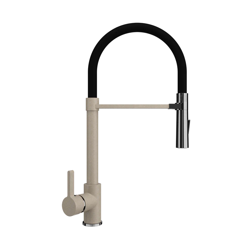 Смеситель ULGRAN U-024 –  это стильный и современный кухонный смеситель с высоким гибким изливом черного цвета. Материал корпуса выполнен из высококачественной латуни, а окрашивание под «искусственный камень» выполняется на собственном производстве, что позволяет идеально попасть в цвет моек ULGRAN. В качестве керамического картриджа используется известный бренд Wanhai диаметром 40 мм с высокой пропускной способностью в 500 тысяч циклов «открывания-закрывания». На подвижные части картриджа Wanhai нанесена специальная невымываемая силиконовая смазка, а керамические пластины изготовлены из 96% оксида алюминия, что, в сочетании с высоким качеством шлифовки обеспечивает долговечность, надежность, плавность хода рукоятки. Смеситель оборудован съемным пластиковым аэратором для экономии воды и гибким изливом на 360 градусов. В комплектацию входят: керамический картридж Wanhai, гибкая подводка 450 мм, комплект крепежных элементов, технический паспорт и гарантийный талон. Заводская гарантия составляет 3 года на материал корпуса, 1 год на комплектующие к смесителю и 1 год на материал покрытия.