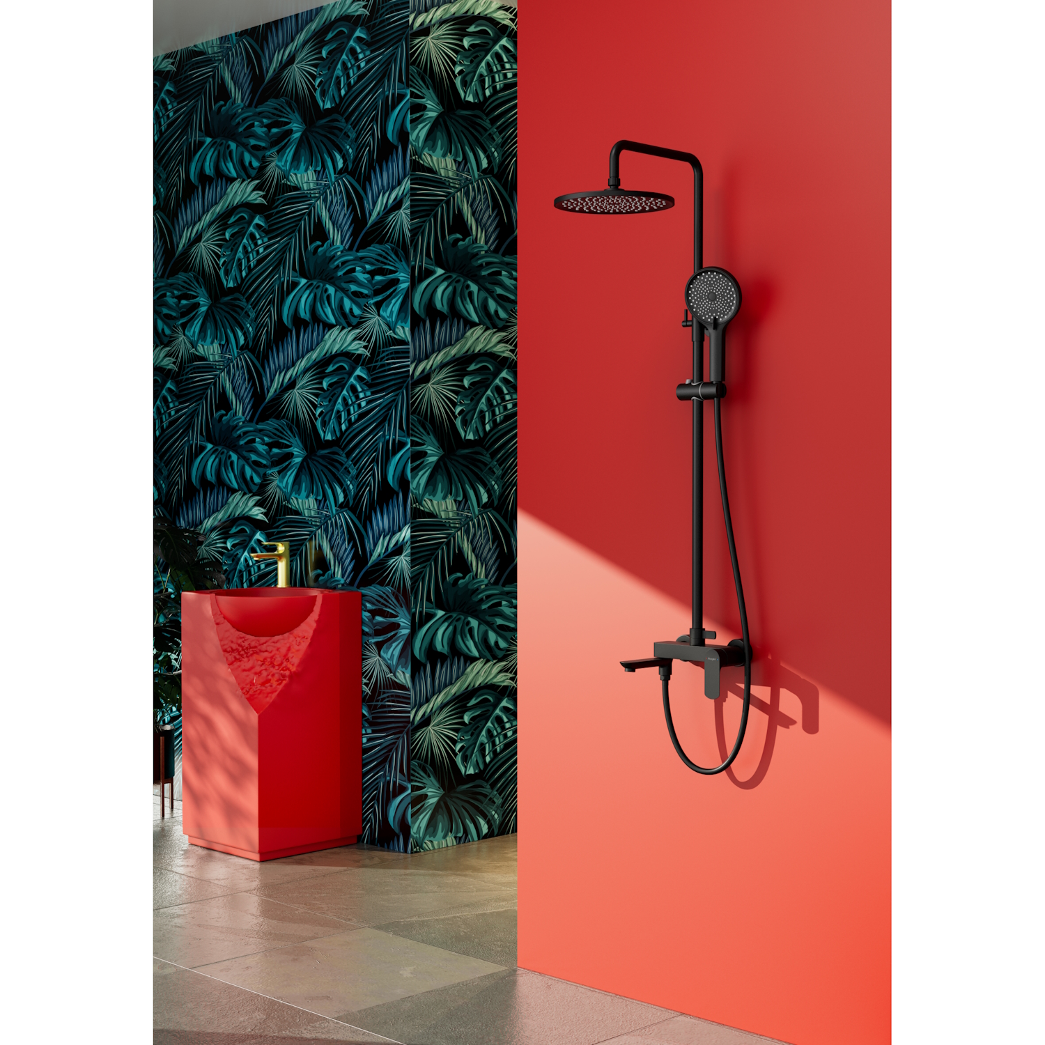 Душевая система Raglo R03.24.06. Цвет: черный. Материал: латунь. Управление: однорычажное. Механизм: керамический картридж. Излив: поворотный. Аэратор. Регулируемая по высоте душевая штанга: 1065-1565 мм. Форма верхнего душа: круглая. Диаметр верхнего душа: 255 мм. Регулируемый  по высоте и наклону держатель ручного душа. Форма ручного душа: круглая. Количество режимов струи ручного душа: 3. Отверстия для монтажа: 3. Стандарт подводки: G 1/2. Монтаж: на стену. Керамический картридж 35 мм - R500.35.01. Переключатель с керамическими пластинами (угол поворота – 90°) - R501.526. Переключатель в изливе - R501.527. Аэратор -  R540.02.06. Душевой шланг 1.5м - R403.15.06.