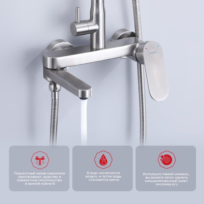 Душевая система для ванны Raglo. Артикул: R10.24.05. Материал - нержавеющая сталь SUS304. Цвет - сатин. Керамический картридж 35 мм - R500.352. Переключатель с керамическими пластинами (угол поворота – 90°) - R501.526H. Переключатель в изливе - R501.527. Излив - функция переключения. Аэратор для водопроводной воды Neoperl с функцией самоочистки - R540.24. Душевой шланг нержавеющая сталь 1.5м - R403.15.05. Душевая лейка - 3 режима (пластик/силикон). Верхний душ - ∅300мм (нержавеющая сталь). В комплекте ксцентрики с отражателями, держатель лейки, крепеж штанги.