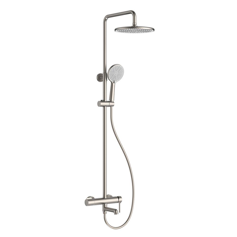 Душевая система Raglo R20.24.05, сатин Стиль: современный Цвет: сатин Материал корпуса: латунь Форма: округлая Монтаж: настенный Тип управления: одноручковый Излив: поворотный с функцией переключения Тип дивертора:  картриджный переключатель (угол поворота 180°) Душевая лейка: 3-х режимная функциональная лейка (пластик/силикон) Душевой шланг: силиконовый 1,5 м Форма верхнего душа (ШхД): круглая ∅250мм Регулируемая душевая штанга: 1130-1480 мм Стандарт подводки: 1/2 на эксцентрике
