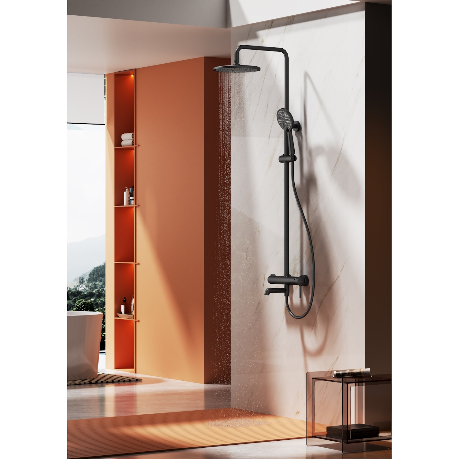 | Комплектация | Верхний душ (душевая штанга) с держателем лейки, ручной душ, смеситель, шланг |