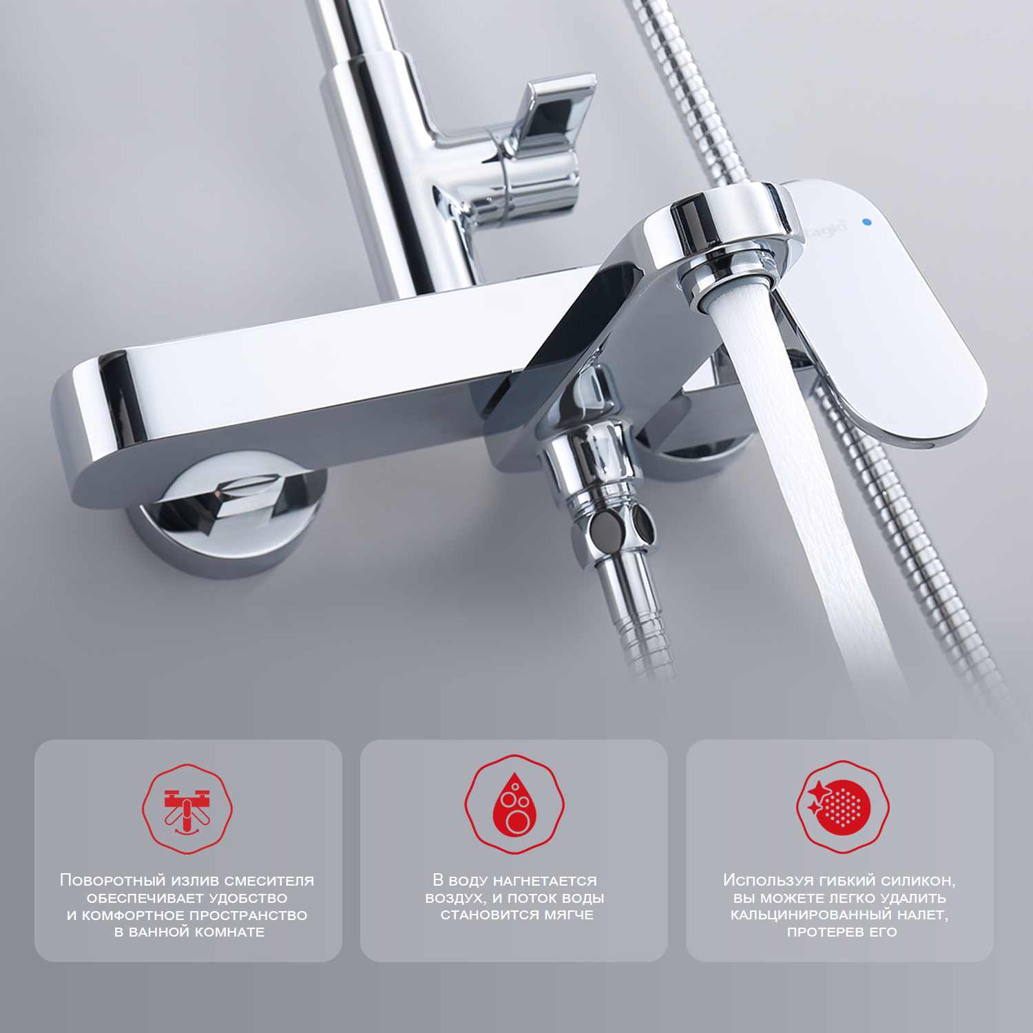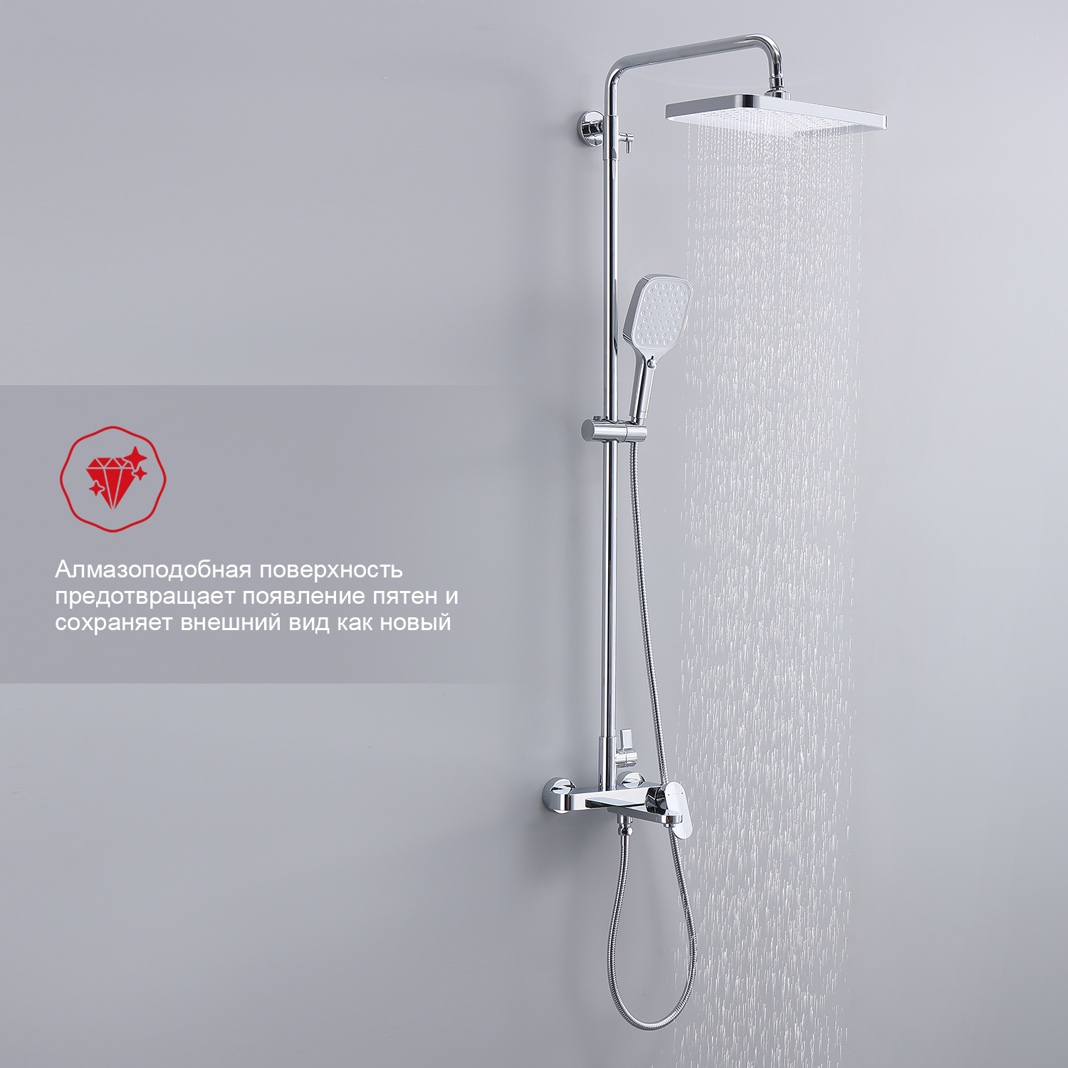 Верхний душ (душевая штанга) с держателем лейки, ручной душ, смеситель, шланг