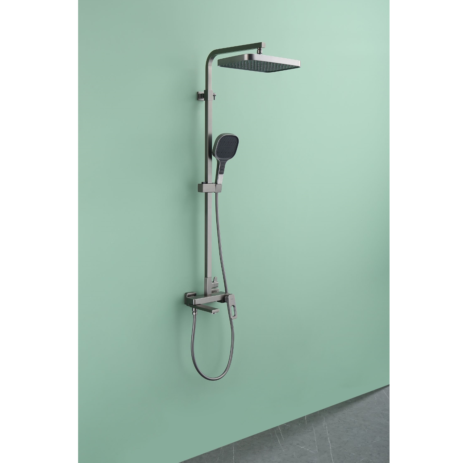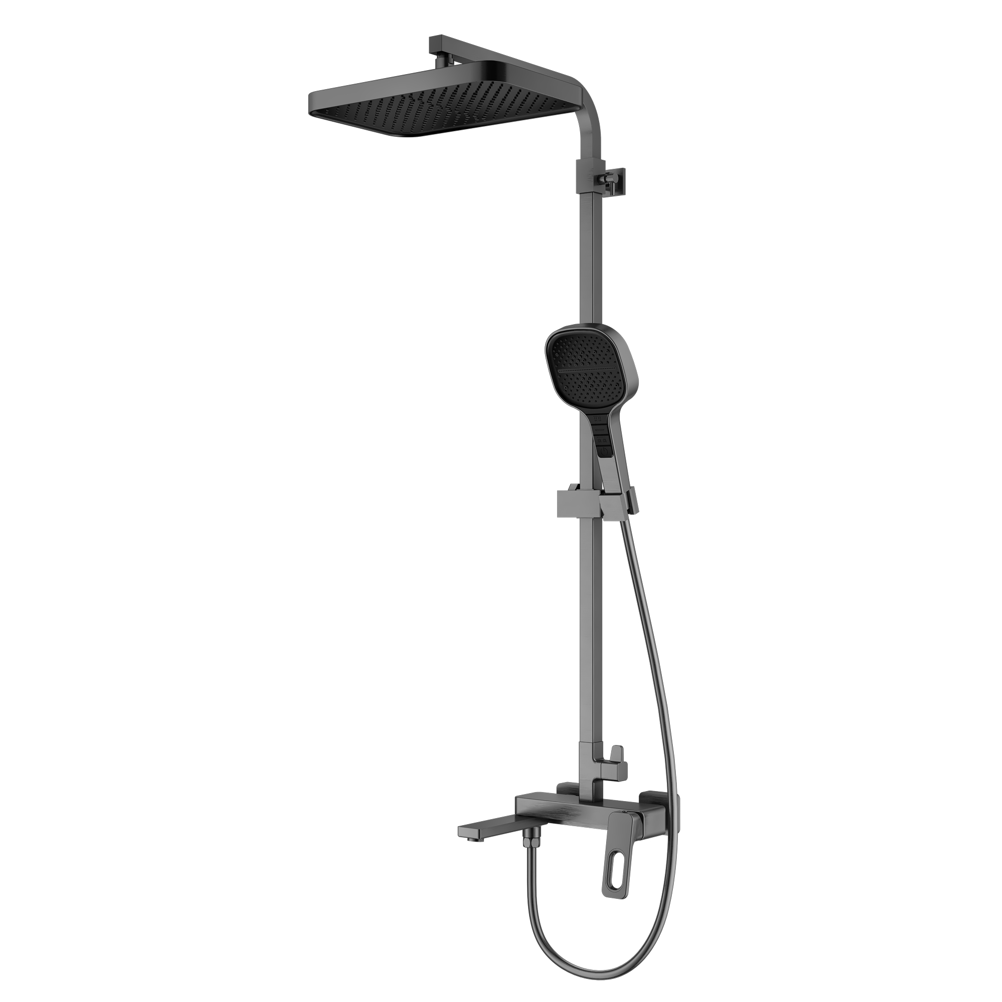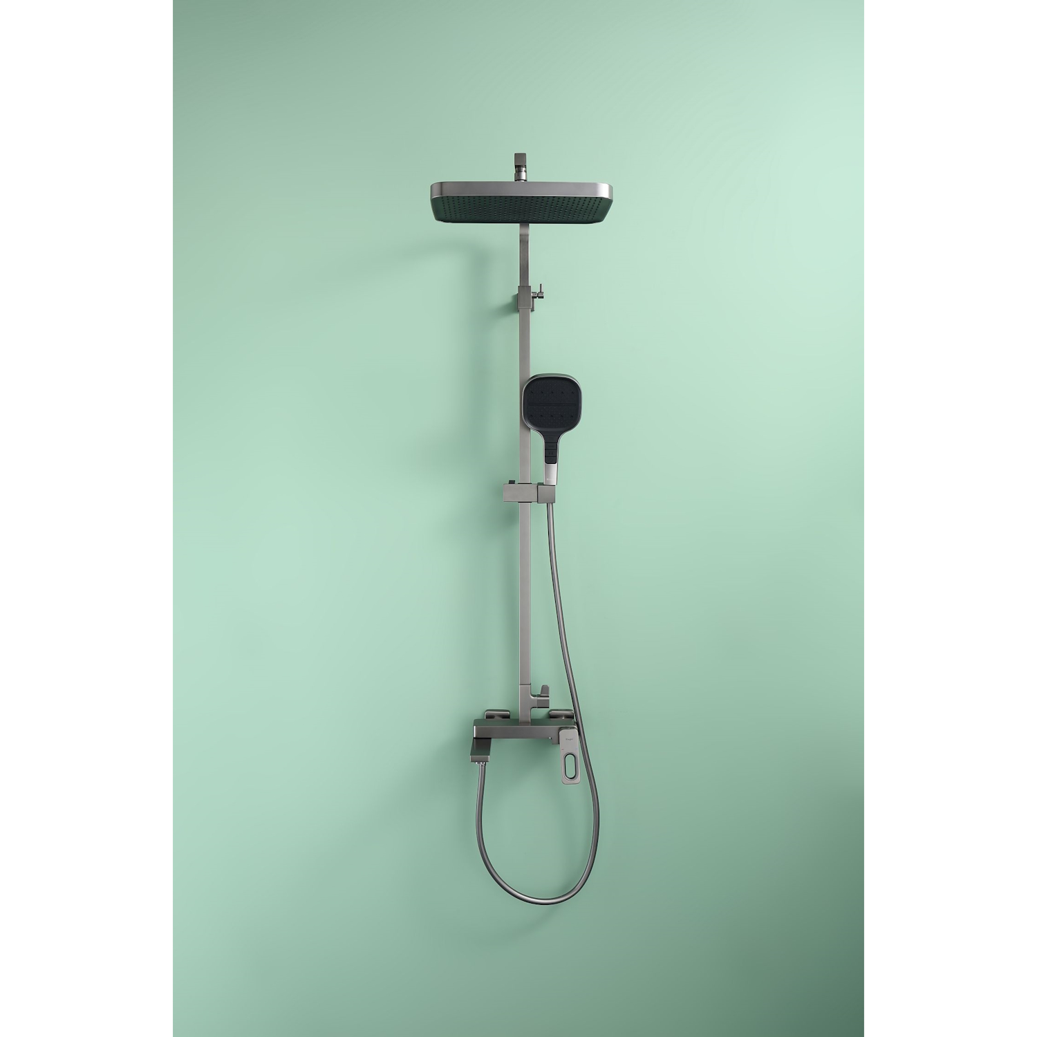 Душевая система Raglo R51.24.09. Цвет: графит. Материал: латунь. Управление: однорычажное. Механизм: керамический картридж. Излив: поворотный. Аэратор. Регулируемая по высоте душевая штанга: 1087-1655 мм. Форма верхнего душа: прямоугольная. Размер верхнего душа (ШхД): 330х220 мм. Регулируемый по высоте и наклону держатель ручного душа. Количество режимов струи ручного душа: 4. Отверстия для монтажа: 3. Стандарт подводки: G 1/2. Монтаж: на стену. Керамический картридж 35мм - R500.35.01. Переключатель с керамическими пластинами (угол поворота – 90°) - R501.526. Переключатель в изливе - R501.527. Излив - функция переключения. Аэратор - R540.02.09. Душевой шланг 1.5м - R403.15.09.