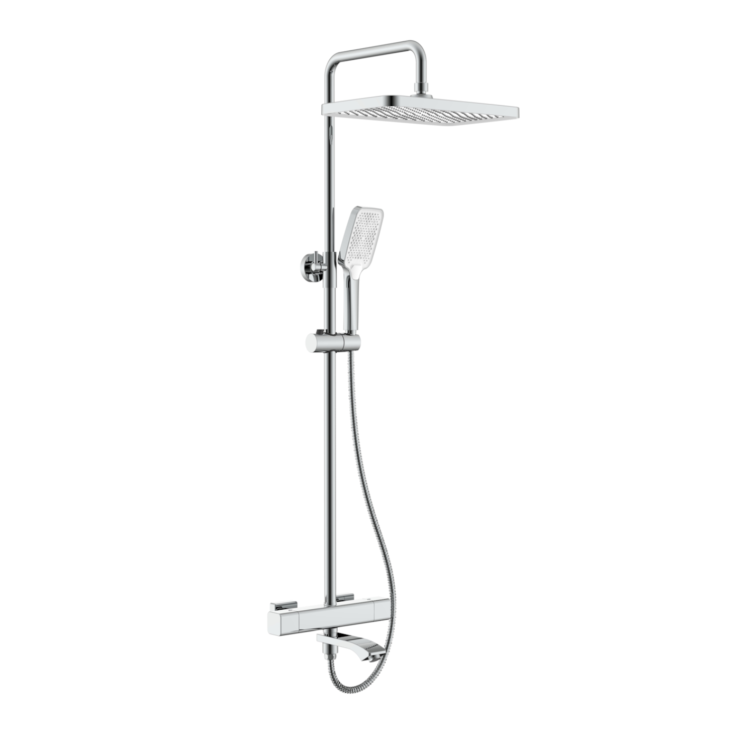 | Комплектация | Верхний душ (душевая штанга) с держателем лейки, ручной душ, смеситель, шланг |