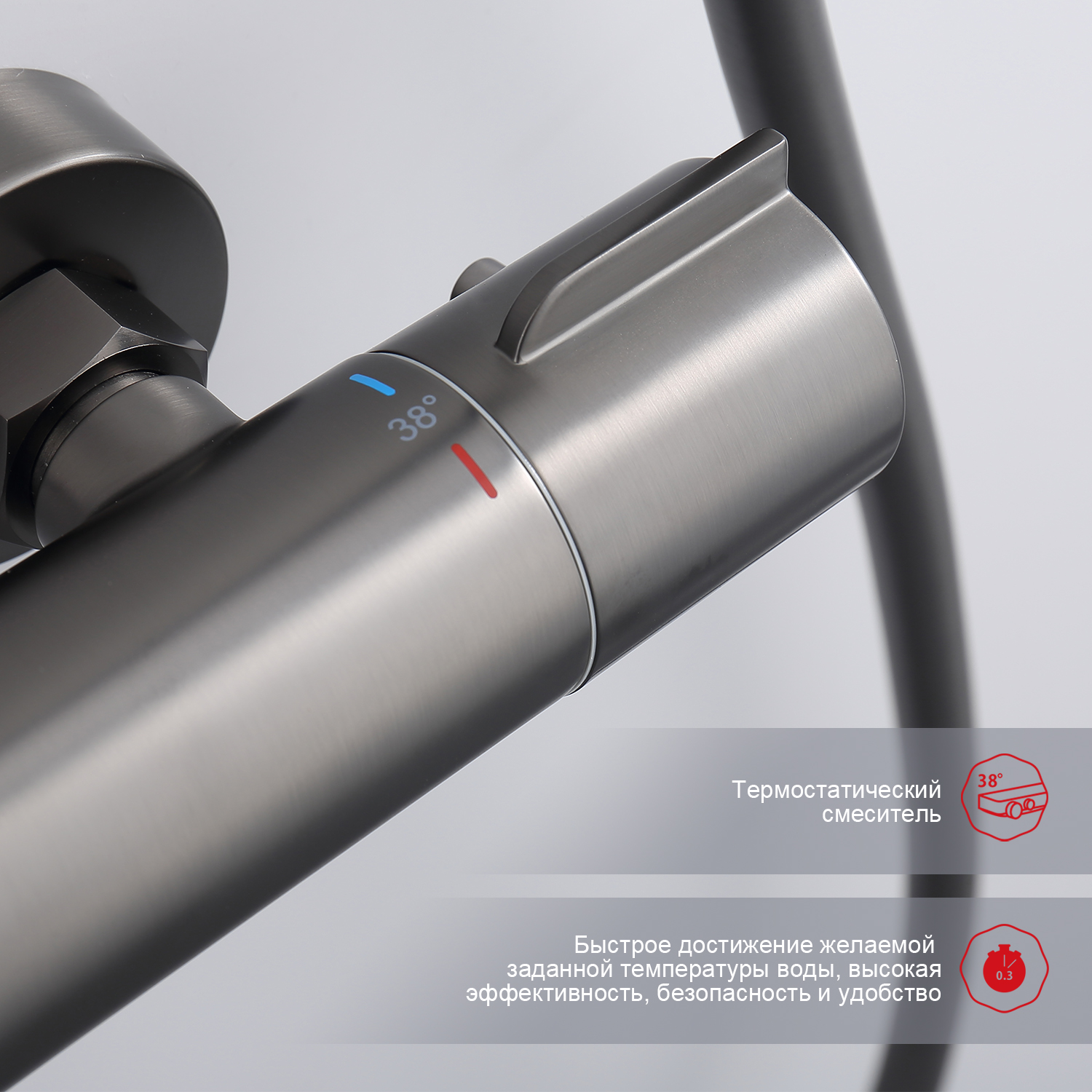 Душевая система Raglo R20.26.09 с термостатом. Цвет: графит. Материал: латунь. Управление: термостат. Механизм: термостатический картридж. Излив: поворотный. Аэратор. Регулируемая по высоте душевая штанга: 1130-1480 мм. Форма верхнего душа: круглая. Диаметр верхнего душа: 250 мм. Регулируемый по высоте и наклону держатель ручного душа. Форма ручного душа: круглая. Количество режимов струи ручного душа: 3. Отверстия для монтажа: 3. Стандарт подводки: G 1/2. Монтаж: на стену. Термостатический картридж - R502.551. Переключатель с керамическими пластинами (угол поворота – 180°) - R505.01. Переключатель в изливе - R501.527. Излив - функция переключения. Аэратор - R540.02.09. Душевой шланг 1.5м - R403.15.09.
