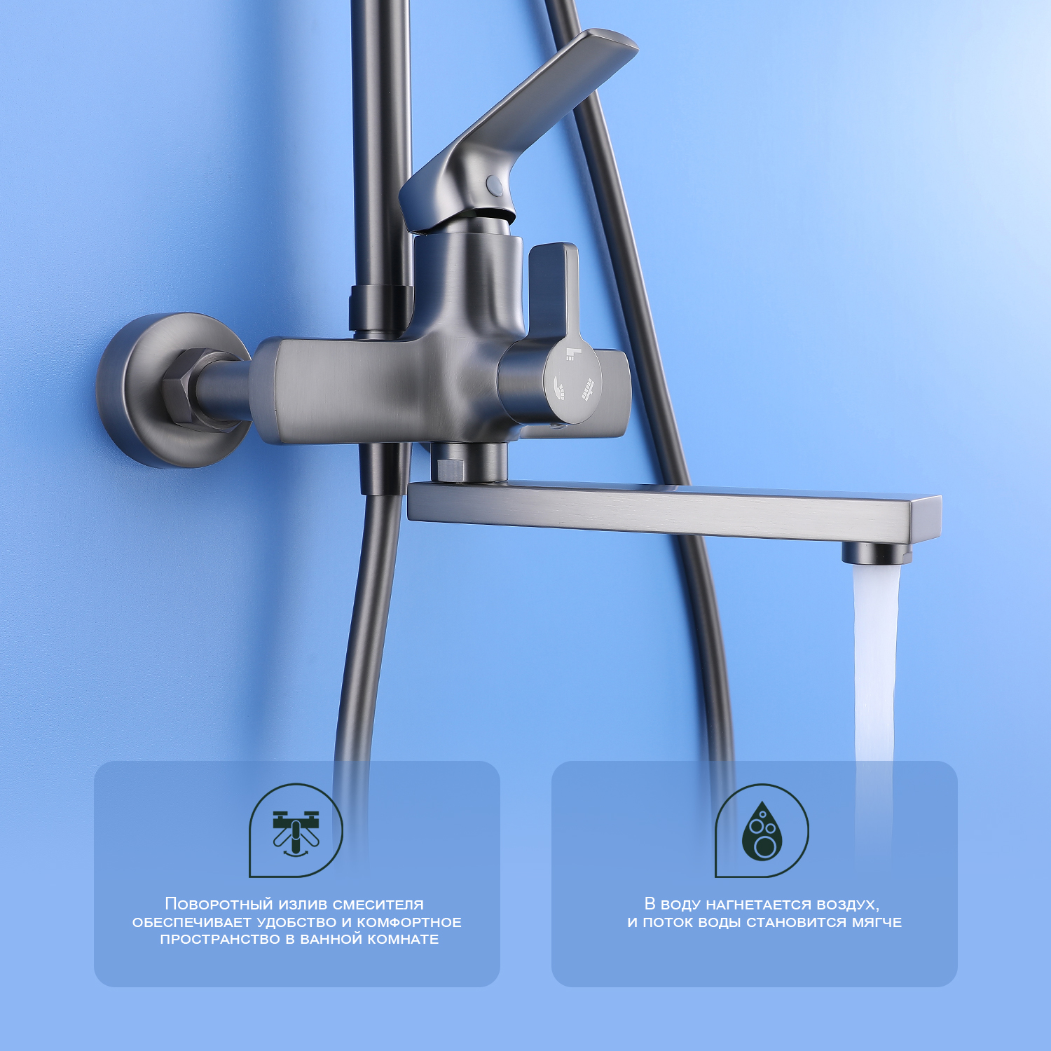 Верхний душ, душевая штанга с держателем, лейка, ручной душ, смеситель, шланг