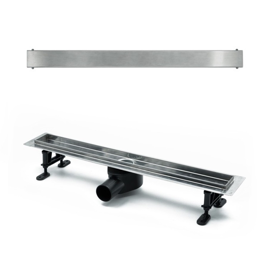 водоотводящий желоб из нержавеющей стали; декоративная панель "lines"; заглушка монтажная; поворотный сифон DN50, выход вбок; комплект регулируемых опор; стакан с мембраной; улавливатель волос и мусора; гидроизоляционная лента; сервисный ключ