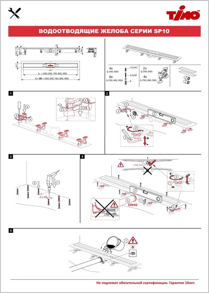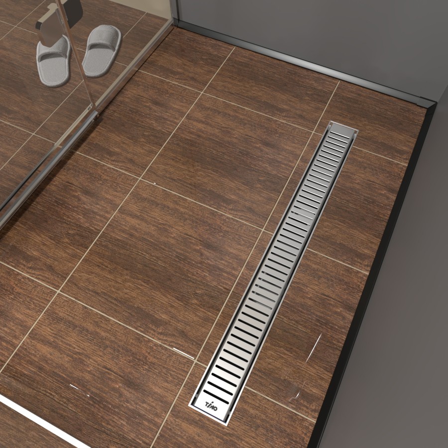 | Комплектация | пластиковый водоотводящий желоб с порогами из нержавеющей стали; встроенный сифон DN40, выход вбок 90°; встроенный шариковый сухой затвор; декоративная вставка; комплект регулируемых опор; улавливатель волос и мусора; гидроизоляционная лента; сервисный ключ. |