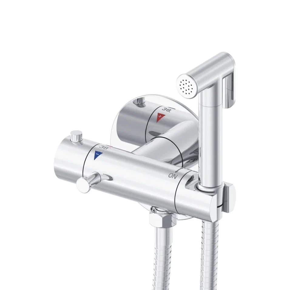Гигиенический душ с термостатом Rose R915, хром. Управление: термостат. Материал: латунь. Монтаж: внутренний (скрытый). На корпусе гигиенического душа расположен крючок для полотенца.