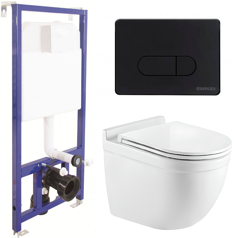 Закажите товар "Комплект унитаза CeramaLux 2198 с инсталляцией Berges Wasserhaus Novum D5 040235 с сиденьем Микролифт и Черной матовой клавишей смыва"