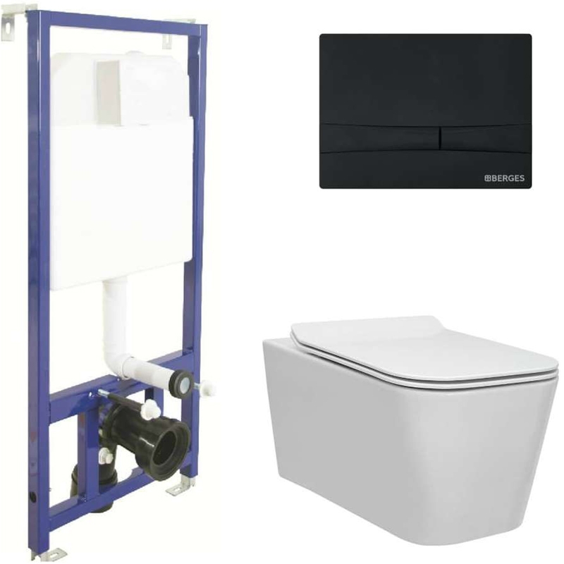 Закажите товар "Комплект унитаза с инсталляцией Berges Floe Rimless 043224 с сиденьем Микролифт и Черной клавишей смыва"