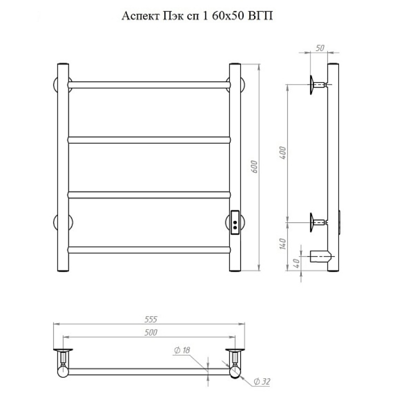 Полотенцесушитель Аспект Пэк сп 1 60х50 черный ВГП. Коллекция: Аспект Пэк сп 1 серия. Тип: электрический. Форма: лесенка. Мощность (Вт): не более 100Вт. Количество перекладин: 4. Материал:  сталь. Подключение: скрытое электрическое соединение/электропровод с вилкой. Дополнительная информация: выключатель с таймером на 2, 4 и 6 часов работы и терморегулятором встроен в коллектор полотенцесушителя.