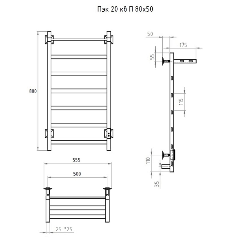 Полотенцесушитель Пэк 20 кв П 80х50. Коллекция: ПЭК 20 кв. Тип: электрический. Форма: лесенка. Мощность (Вт): не более 100Вт. Количество перекладин: 6. Материал: нержавеющая сталь AISI 201. Подключение: скрытое электрическое соединение/электропровод с вилкой.