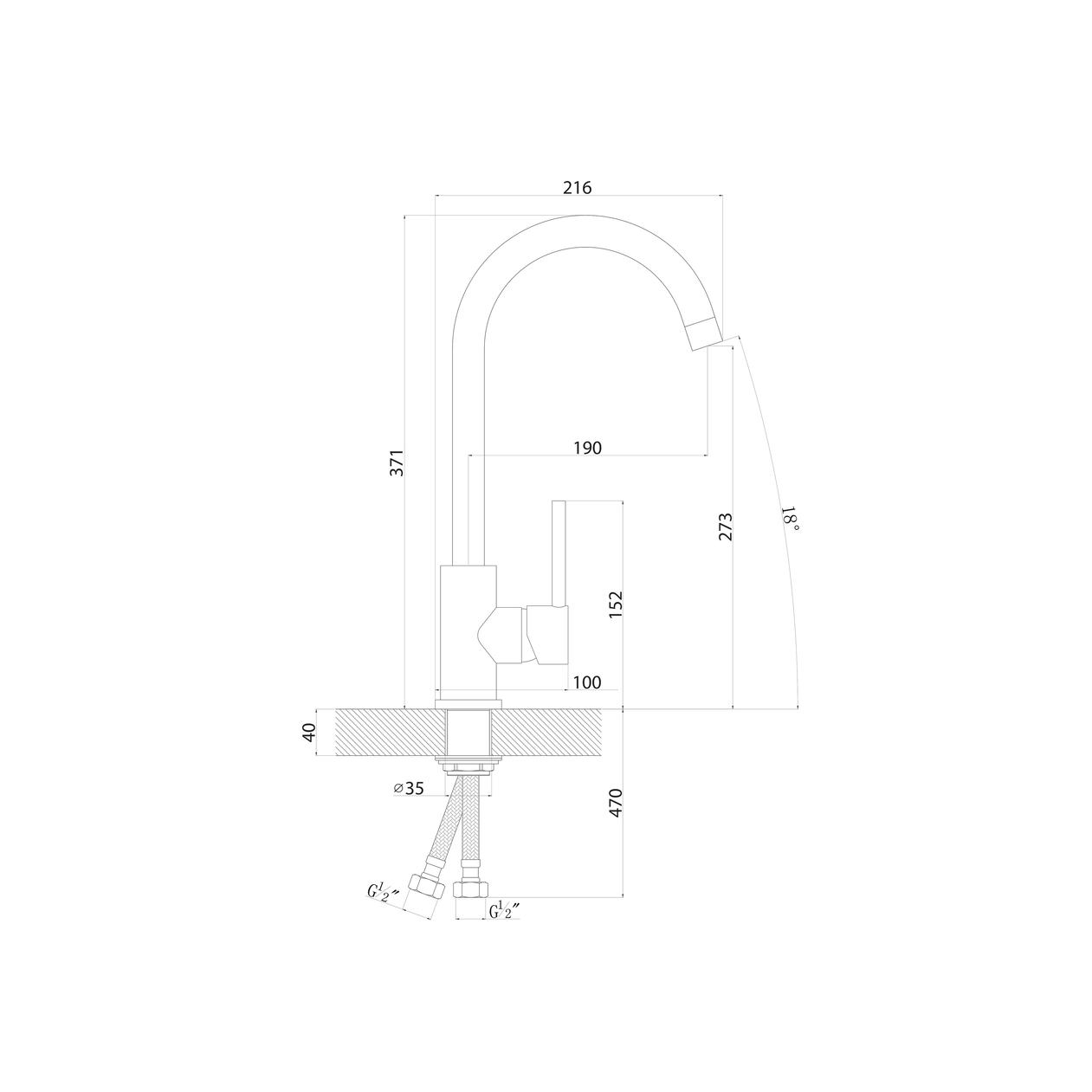 Смеситель однорычажный с высоким изливом. Материал - нержавеющая сталь. Поворотный излив. Керамический картридж 35мм. Гибкая подводка.