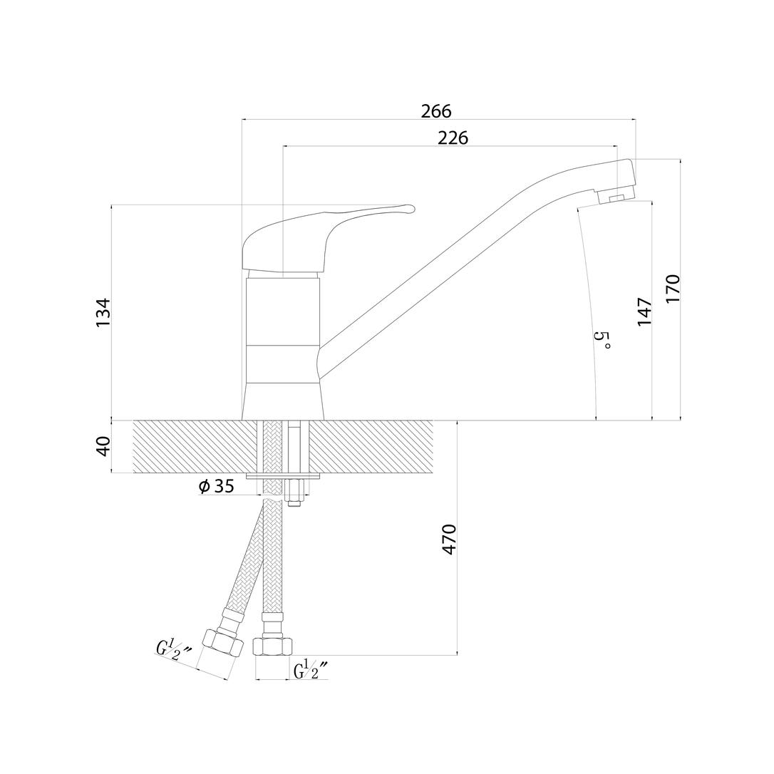 Смеситель однорычажный с низким изливом. Материал - нержавеющая сталь. Поворотный излив. Керамический картридж 40мм. Гибкая подводка.