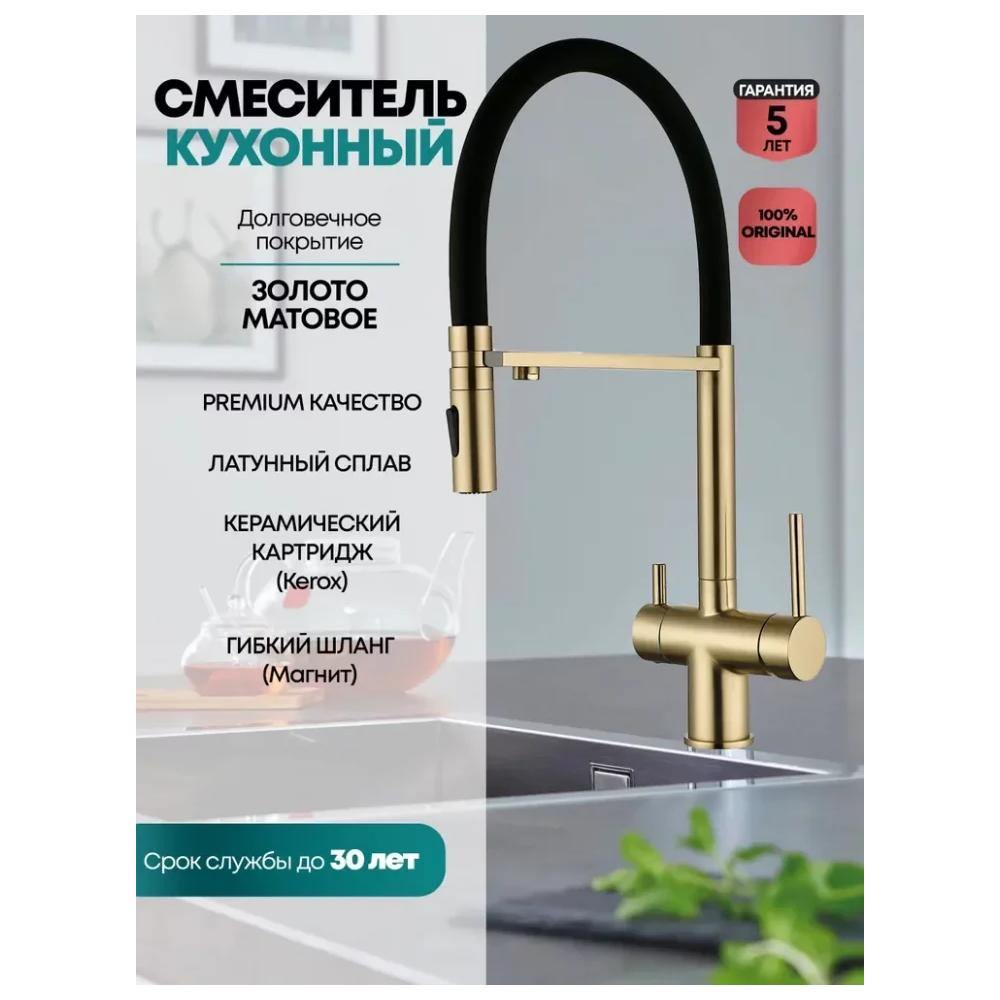 Закажите товар "Смеситель для кухни с гибким изливом и подключением фильтра Grocenberg GB4096MG, матовое золото"