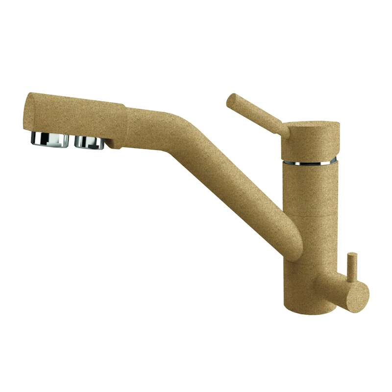 Смеситель ДУЭТ, цвет Терракота  (DUET Terracota). Элегантное и функциональное решение для Вашей кухни. Встроенный канал для питьевой воды облегчает процесс фильтрации и подачи чистой воды. Теперь у вас всегда будет доступ к чистой и свежей воде прямо из вашей мойки. Отдельный рычаг для подачи чистой воды от фильтра: подключается через отдельный шланг к системе фильтрации водопроводной воды, например марки Гейзер, Барьер и другие. Фильтр приобретается отдельно. Поворотный излив обеспечивает удобство использования этого кухонного смесителя. Благодаря поворотному крану и немаркому покрытию, смеситель удобен в использовании и прост в уходе. Поворотный излив удобен как при мытье посуды, так и при чистке мойки. Прочный материал, из которого выполнен данный кухонный смеситель, обеспечивает долговечность изделия даже при интенсивной эксплуатации. Керамический картридж диаметром 40 мм обеспечивает надежность и плавность хода ручки управления подачей воды. Антиизвестковый аэратор помогает в экономии воды. Внутри аэратора воздух смешивается с водой, что образует насыщенную пузырьками струю, которая рассеивается на множество мелких потоков. Это делает струю более мягкой и объёмной, снижает разбрызгивание воды. Простота монтажа и надежность соединения гарантируют удобство установки и долгий срок службы. Гибкая подводка в комплекте. Выбирайте качество и комфорт вместе с нашим смесителем для кухни!