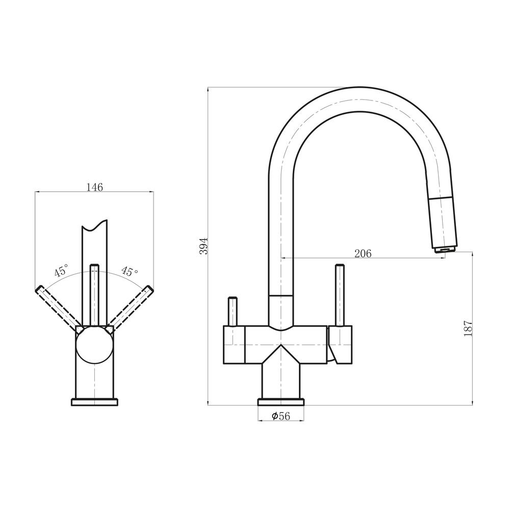 Смеситель с высоким выдвижным изливом и подключением к фильтру чистой воды. Материал — нержавеющая сталь. Материал цветного покрытия — композитная краска. Керамический картридж 35 мм.. Комплектуется гибкой подводкой.