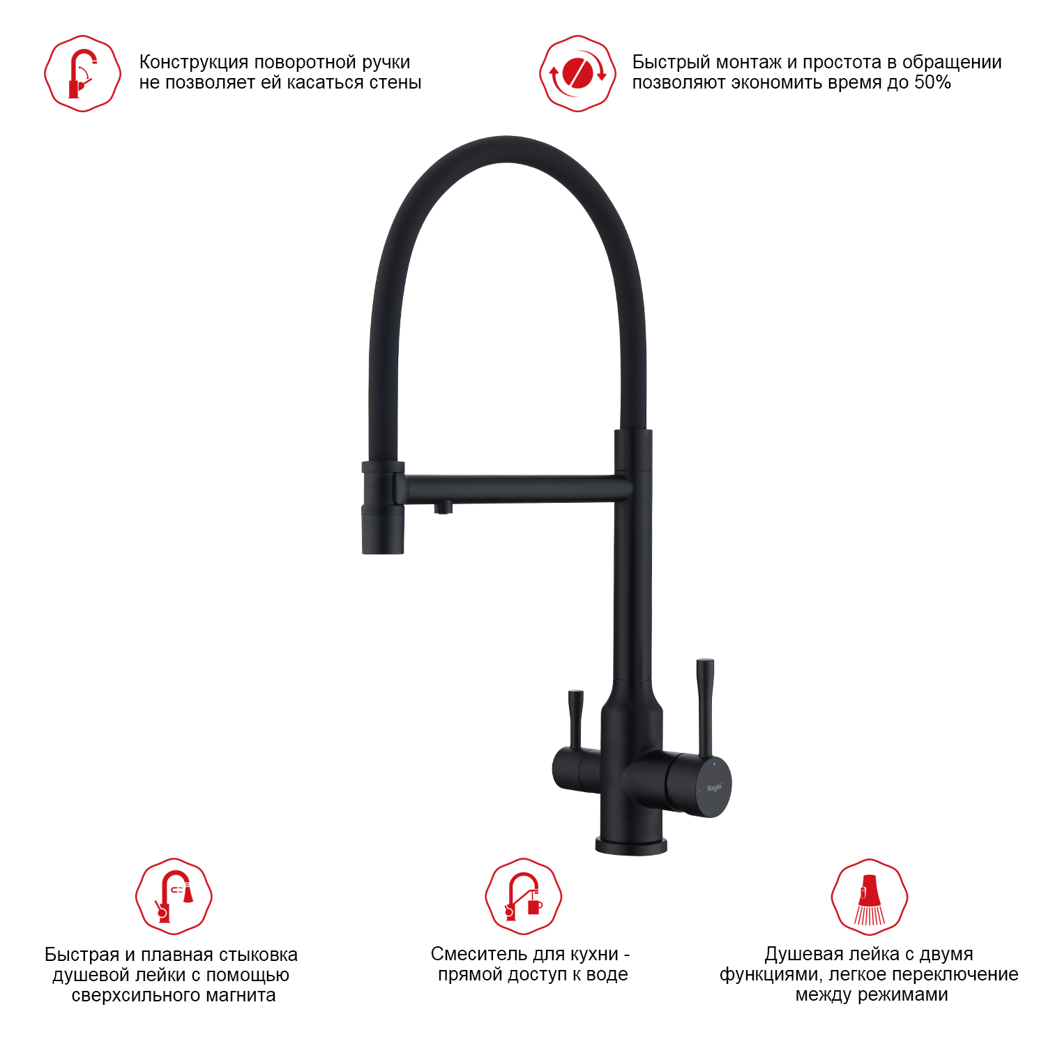 Raglo R81.63.06. Цвет: черный. Смеситель для кухни со съемным изливом на магните и подключением фильтра питьевой воды. Гибкий излив черного цвета. Крепление на усиленной гайке. Подводка длиной 55 см имеет латунные гайки. Гарантия на смеситель 7 лет и 2 года на покрытие!