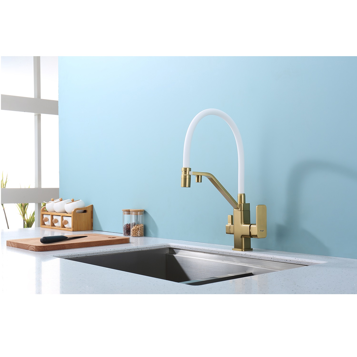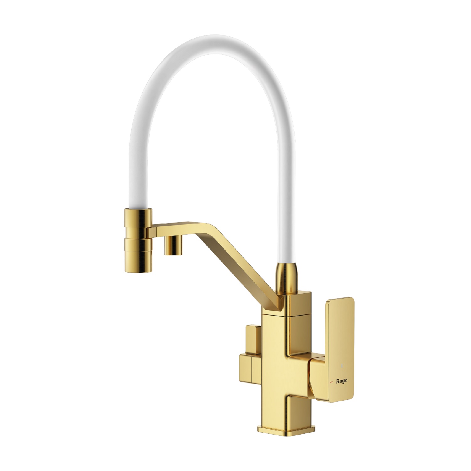 Raglo R85.62.03. Цвет: сатин золотой. Смеситель для кухни с подключением к фильтру питьевой воды. Гибкий съемный шланг значительно расширяет зону использования смесителя, благодаря этому можно мыть объемную посуду. Модель предназначена для одновременного подключения к водопроводу и фильтру и позволяет снабжать как обычной, так и питьевой водой.