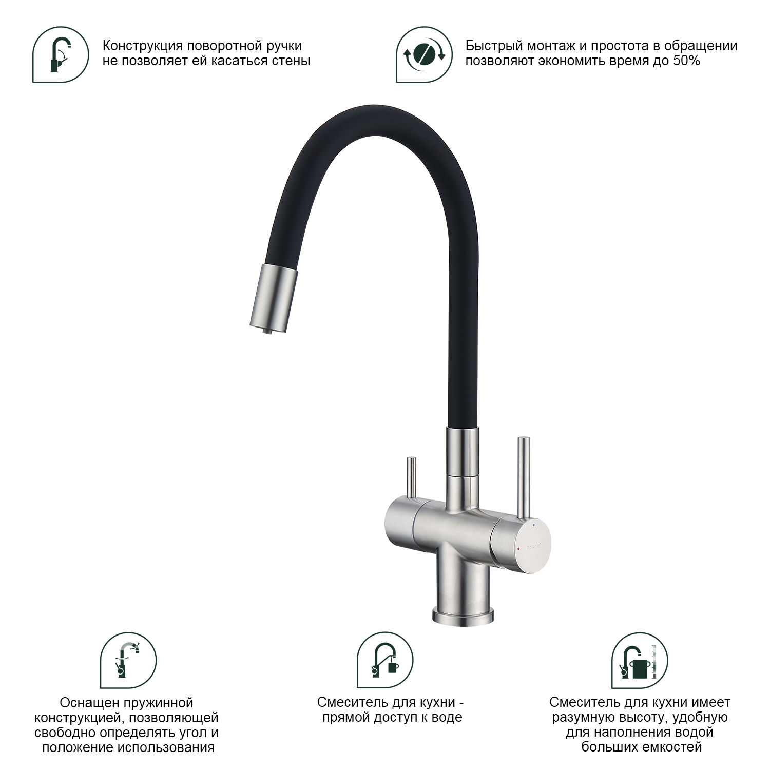 Смеситель для кухни с подключением к фильтру питьевой воды Splenka S70.64.05. Цвет: сатин. Гибкая подводка 50 см идет в комплекте. Благодаря грамотно разработанной конструкции, прибор отлично справляется с регулированием температуры и напора потоков воды. Однорычажные смесители максимально удобны при эксплуатации, всего одним движением руки можно закрыть или открыть воду, имеют стильный внешний вид, а также комфортность в использовании. Гарантия 5 лет.