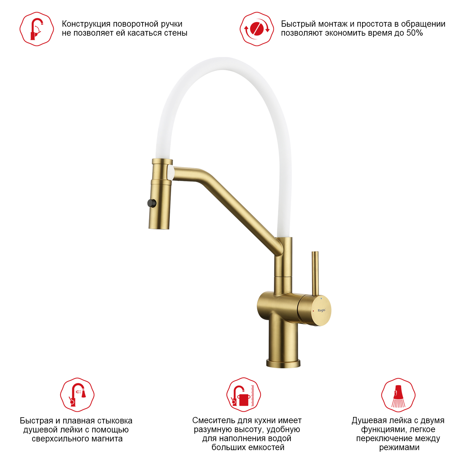 Raglo R86.41.03. Цвет: сатин золотой. Смеситель для кухни со съемным изливом на магните. Кухонные смесители торговой марки RAGLO  – это оригинальность и уют для каждого дома. Кран выполнен из высококачественных материалов, что гарантирует его долговечность и надежность. Эта сантехника отличается полезным функционалом, экологичными решениями, оригинальным стилем и легкостью монтажа. Поворотный излив позволяет с большим удобством пользоваться им на кухне. Оснащен гибкой системой подключения, что облегчает его монтаж и установку. Встроенный аэратор эффективно фильтрует примеси и уменьшает шум от импульсов воды. Гладкая внутренняя стенка обеспечивает мягкий поток воды. Подходит к кухонным мойкам практически любых размеров и форм. Кухонный смеситель является неотъемлемой частью любой кухни, и данный смеситель - отличный выбор для тех, кто ценит качество, надежность и комфорт.