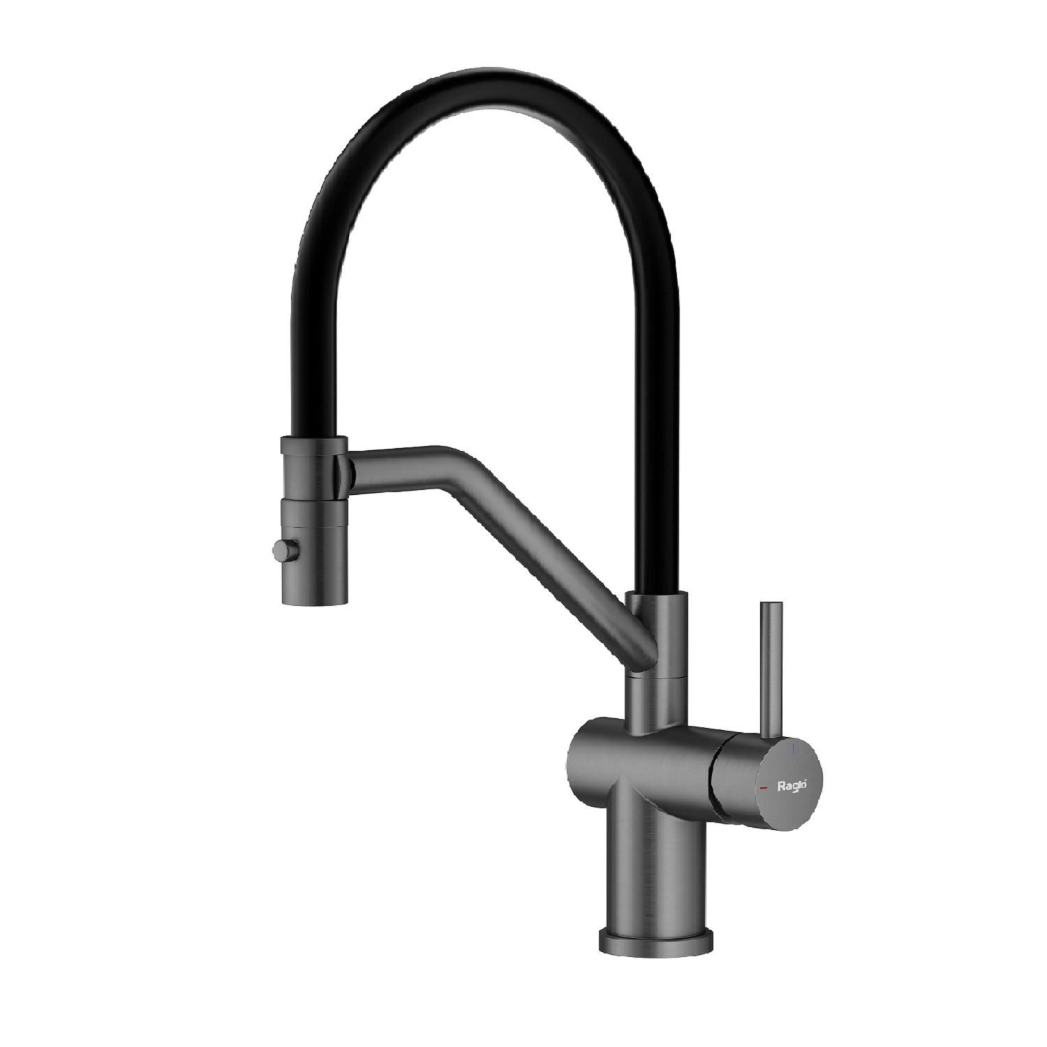 Raglo R86.41.09. Цвет: графит. Смеситель для кухни со съемным изливом на магните. Кухонные смесители торговой марки RAGLO  – это оригинальность и уют для каждого дома. Кран выполнен из высококачественных материалов, что гарантирует его долговечность и надежность. Эта сантехника отличается полезным функционалом, экологичными решениями, оригинальным стилем и легкостью монтажа. Поворотный излив позволяет с большим удобством пользоваться им на кухне. Оснащен гибкой системой подключения, что облегчает его монтаж и установку. Встроенный аэратор эффективно фильтрует примеси и уменьшает шум от импульсов воды. Гладкая внутренняя стенка обеспечивает мягкий поток воды. Подходит к кухонным мойкам практически любых размеров и форм. Кухонный смеситель является неотъемлемой частью любой кухни, и данный смеситель - отличный выбор для тех, кто ценит качество, надежность и комфорт.