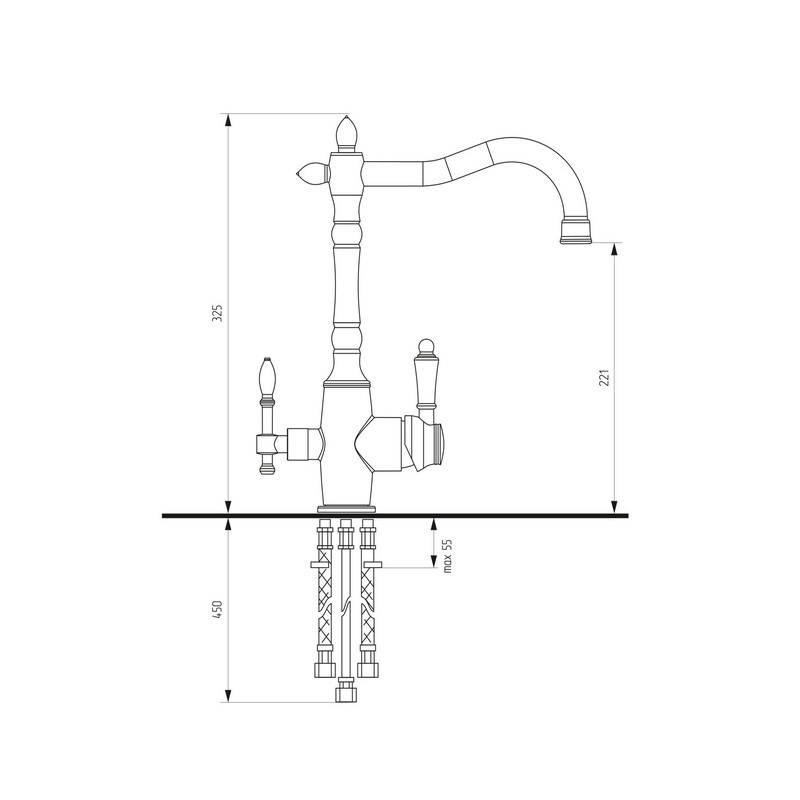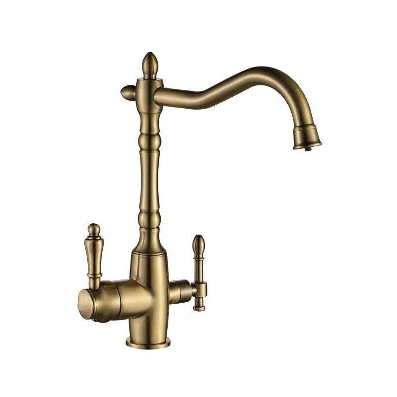 ULGRAN U-018 - классический кухонный смеситель цветом "под бронзу" с дополнительным краном для подключения фильтрованной воды, оснащенный кран-буксой с керамическими пластинами. Реализован тройной подвод воды через один излив: холодная, горячая и фильтрованная. Переход с одного подвода на другой производится поворотом рычага. Набор для соединения с фильтром входит в комплект . Система фильтрации приобретается дополнительно и монтируется под мойку, специальный индикатор сообщает о необходимости замены картриджа. Материал корпуса выполнен из высококачественной латуни с покрытием "под бронзу". В качестве керамического картриджа используется известный бренд Wanhai диаметром 35 мм с высокой пропускной способностью в 500 тысяч циклов "открывания-закрывания".  На подвижные части картриджа  Wanhai  нанесена специальная невымываемая силиконовая смазка, а керамические пластины изготовлены из 96% оксида алюминия, что, в сочетании с высоким качеством шлифовки обеспечивает долговечность, надежность, плавность хода рукоятки.  Смеситель оборудован съемным пластиковым аэратором для экономии воды  и поворотным изливом на 360 градусов. В комплектацию входят:  керамический картридж  Wanhai, гибкая подводка, комплект крепежных элементов,  кран-букса с керамическими пластинами для дополнительного излива для фильтрованной воды, набор для подсоединения фильтра питьевой воды (гибкая подводка + переходник-цанга), технический паспорт и гарантийный талон. Заводская гарантия составляет 3 года на материал корпуса, 1 год на комплектующие к смесителю и 1 год на материал покрытия.
