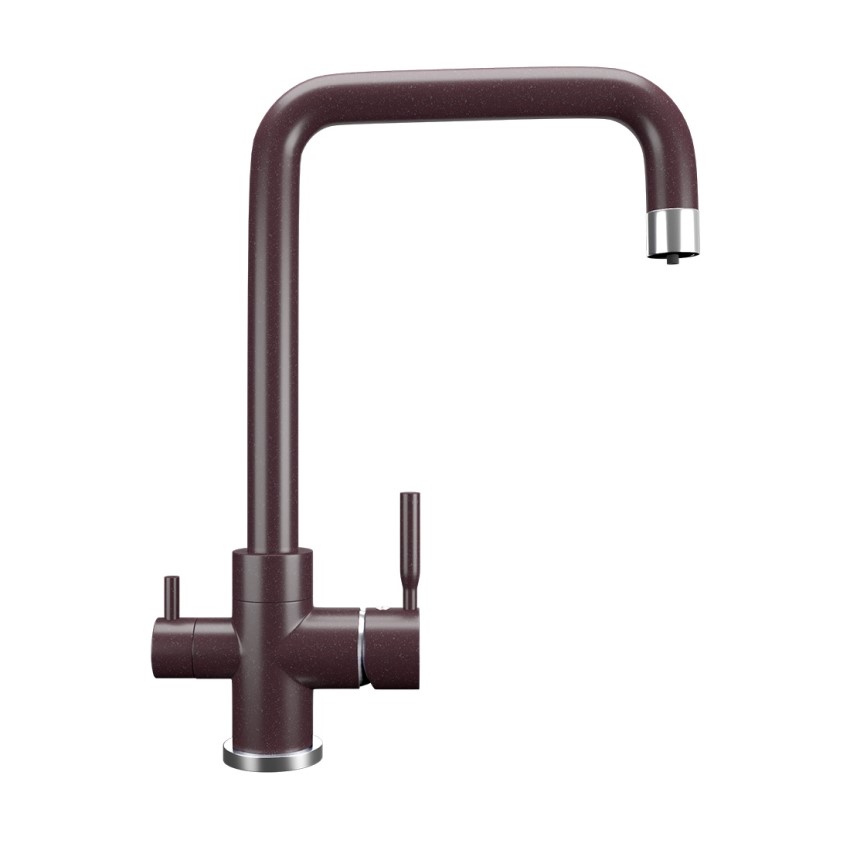 ULGRAN U-019 - современный кухонный смеситель с дополнительным краном для подключения фильтрованной воды, оснащенный кран-буксой с керамическими пластинами. Реализован тройной подвод воды через один излив: холодная, горячая и фильтрованная. Переход с одного подвода на другой производится поворотом рычага. Набор для соединения с фильтром входит в комплект . Система фильтрации приобретается дополнительно и монтируется под мойку, специальный индикатор сообщает о необходимости замены картриджа. Материал корпуса выполнен из высококачественной латуни, а окрашивание под "искусственный камень" в цвет мойки ULGRAN выполняется на собственном производстве, что позволяет идеально попасть в фирменный цвет ULGRAN. В качестве керамического картриджа используется известный бренд Wanhai диаметром 35 мм с высокой пропускной способностью в 500 тысяч циклов "открывания-закрывания".  На подвижные части картриджа  Wanhai  нанесена специальная невымываемая силиконовая смазка, а керамические пластины изготовлены из 96% оксида алюминия, что, в сочетании с высоким качеством шлифовки обеспечивает долговечность, надежность, плавность хода рукоятки.  Смеситель оборудован съемным пластиковым аэратором для экономии воды  и поворотным изливом на 360 градусов. В комплектацию входя:  керамический картридж  Wanhai, гибкая подводка, комплект крепежных элементов,  кран-букса с керамическими пластинами для дополнительного излива для фильтрованной воды, набор для подсоединения фильтра питьевой воды (гибкая подводка + переходник-цанга), технический паспорт и гарантийный талон. Заводская гарантия составляет 3 года на материал корпуса, 1 год на комплектующие к смесителю и 1 год на материал покрытия.