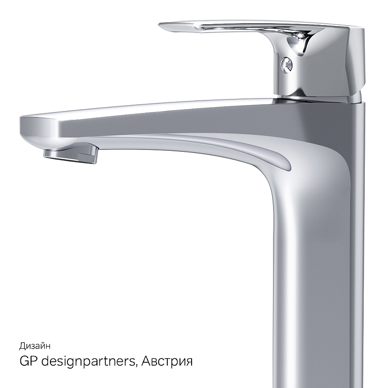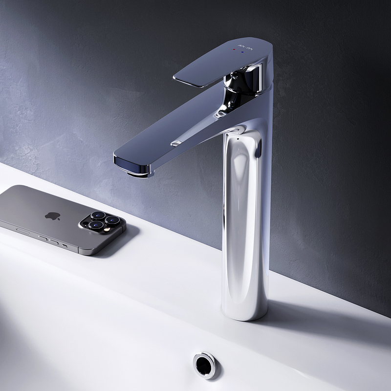 Высокий излив придает смесителю утонченный вид и идеально подойдет для раковины с глубокой чашей, а благодаря обширной зоне движения ручки управлять температурой воды еще проще.