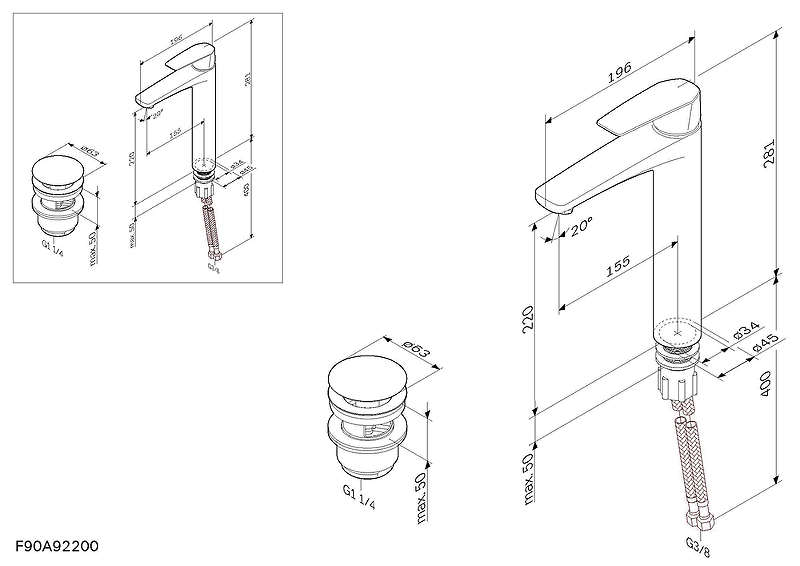 В комплекте поставки: смеситель, гибкая подводка, донный клапан.