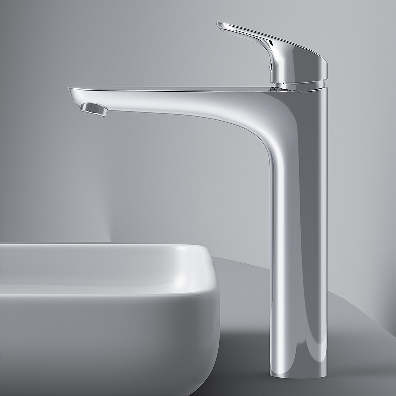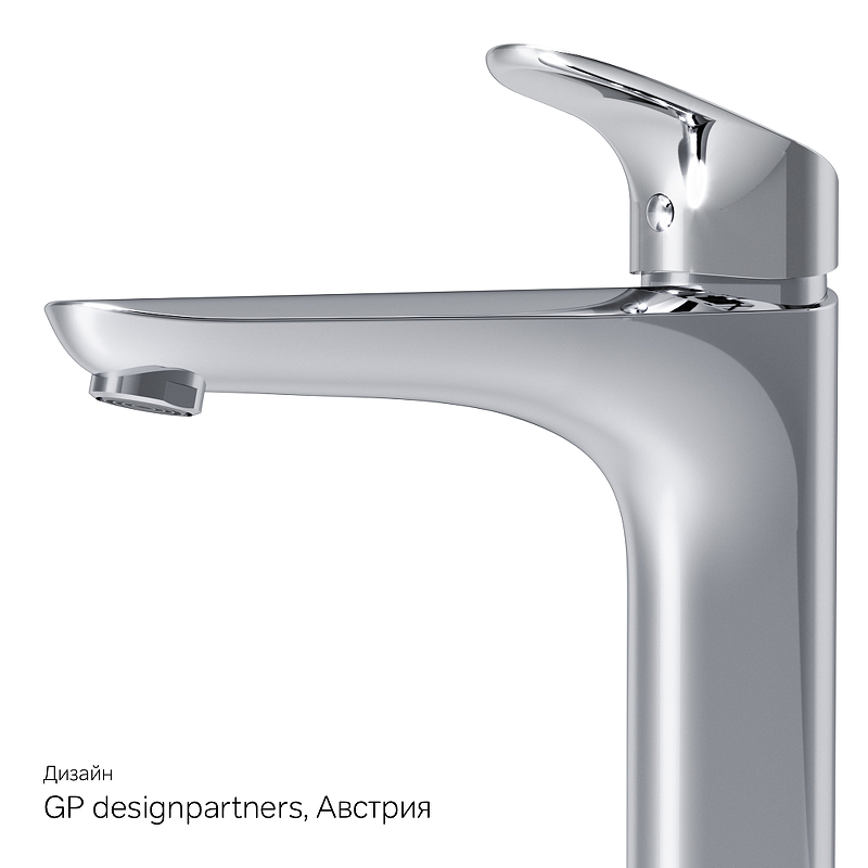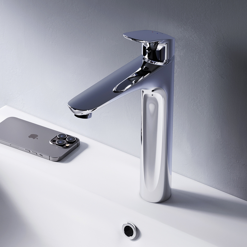 Высокий излив придает смесителю утонченный вид и идеально подойдет для раковины с глубокой чашей, а благодаря обширной зоне движения ручки управлять температурой воды еще проще.