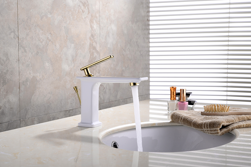 Монолитный смеситель для раковины Lemark Mista изготовлен из латуни в оригинальном дизайном с контрастными деталями в белом и золотом цветах. Смеситель имеет прямоугольную форму, рукоятка изготовлена из металла.