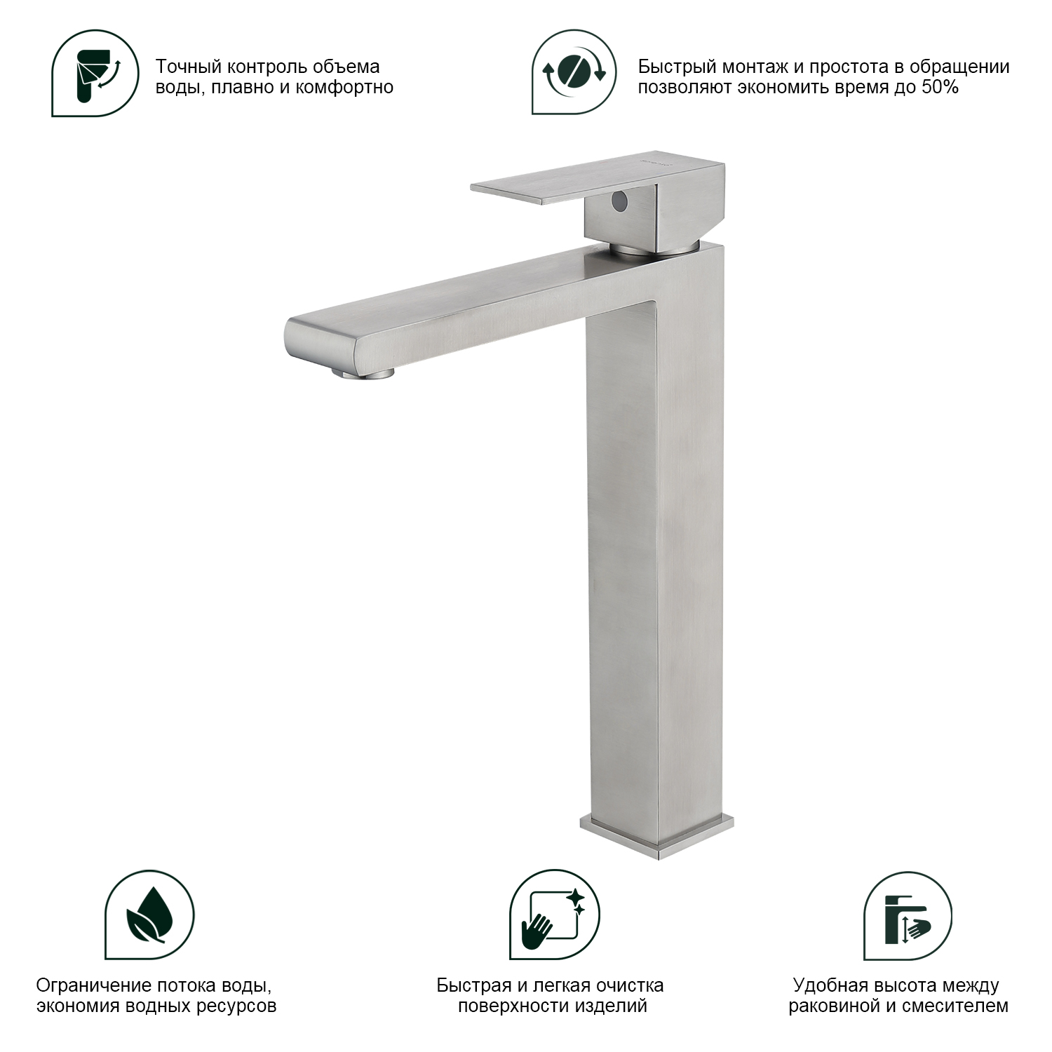 Смеситель для раковины Splenka S224.15.05, сатин. Смеситель высокий для раковины нержавеющая сталь, квадратной формы. Смеситель с креплением на гайке. Все для монтажа и эксплуатации есть в комплекте. Гарантия 5 лет.