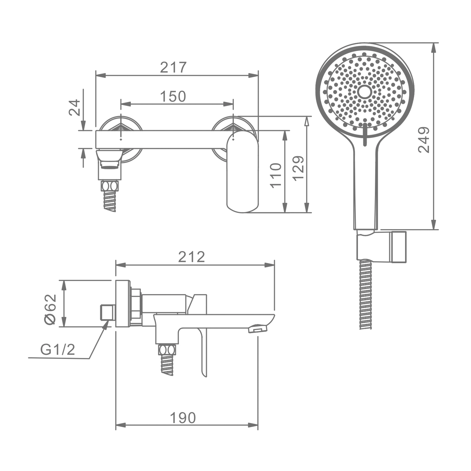 Смеситель, шланг, душевая лейка, держатель, эксцентрики, отражатели.