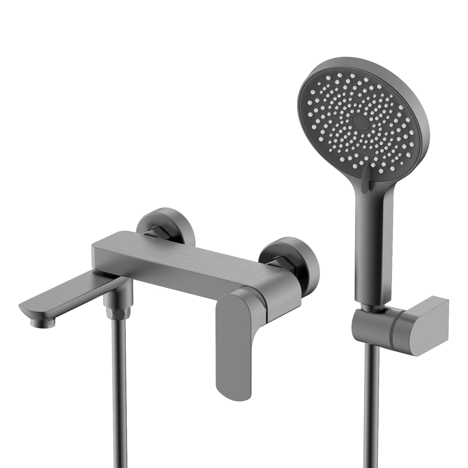 Смеситель для ванны Raglo R03.30.09. Цвет: графит. Материал: латунь. Управление: однорычажное. Механизм: керамический картридж. Излив: поворотный. Аэратор. Форма ручного душа: круглая. Количество режимов струи ручного душа: 3. Отверстия для монтажа: 2. Монтаж: на стену. Керамический картридж 35 мм - R500.35.01. Переключатель с керамическими пластинами (угол поворота – 90°) - R501.527. Аэратор - R540.02.09.   Душевой шланг 1.5м - R402.15.09.