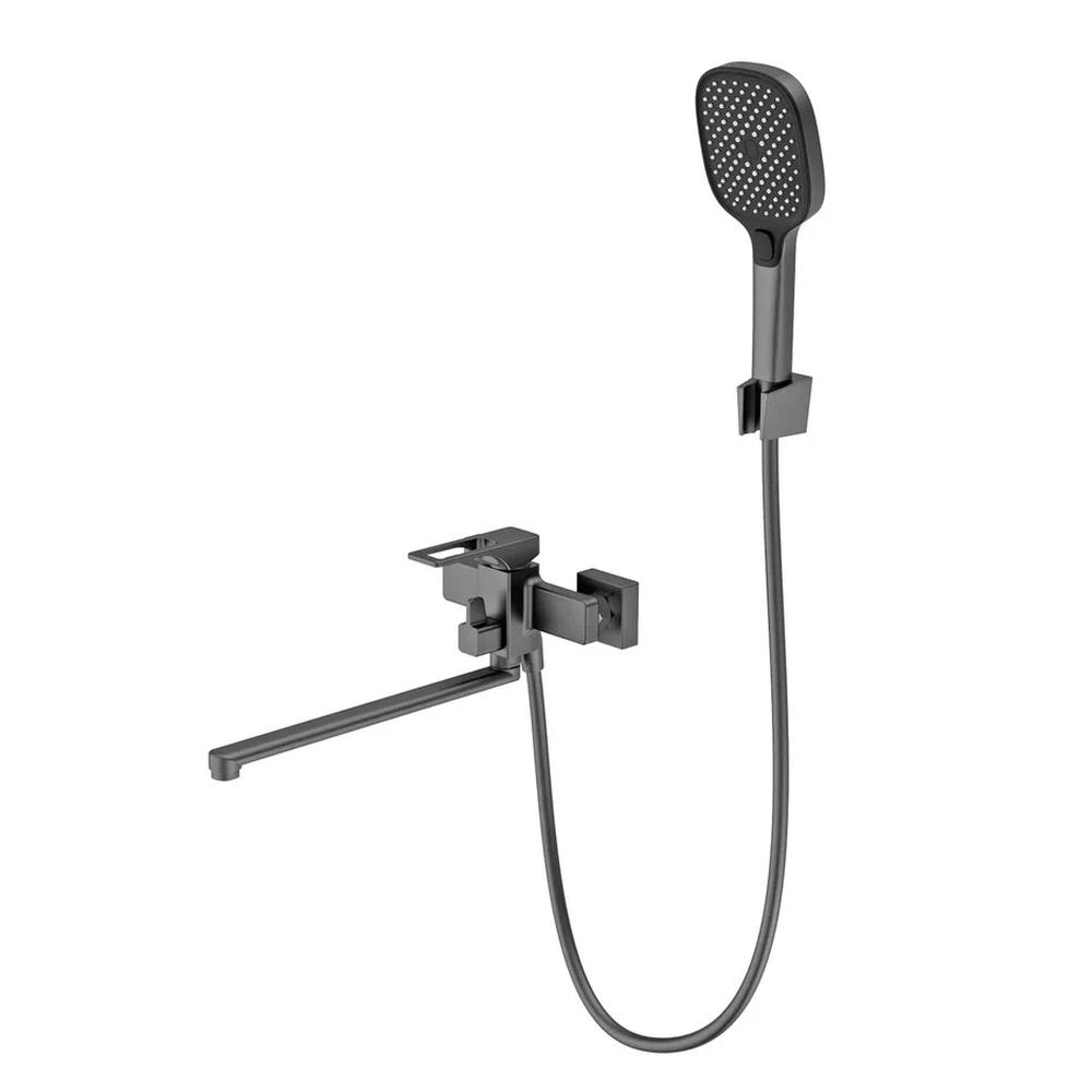 Смеситель для ванны Splenka S55.22.09, графит • Стиль: современный • Цвет: графит • Материал корпуса: латунь • Форма: квадратная • Монтаж: настенный • Кол-во отверстий для монтажа: 2 • Кол-во отверстий для держателя лейки: 1 • Тип управления: одноручковый • Излив: поворотный 35 см • Тип дивертора:  Переключатель с керамическими пластинами (угол поворота 90°) • Душевая лейка: 3-х режимная функциональная лейка • Душевой шланг: силиконовый 1,5 м • Стандарт подводки: 1/2 на эксцентриках