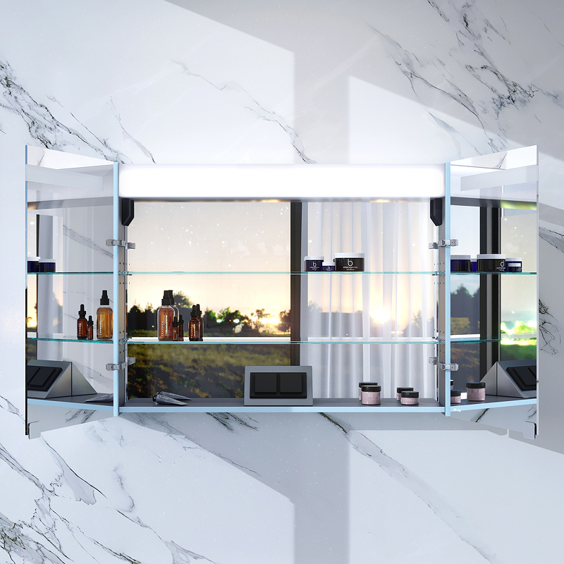 Зеркальный шкаф в ванную AM.PM Sensation 100 M30MCX1001BG с двумя распашными дверцами и двумя полками за ними, с подсветкой сверху, с розеткой и выключателем.
