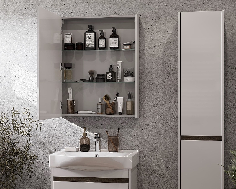 Компактный и вместительный зеркальный шкаф отличается простым и лаконичным дизайном в духе актуальных тенденций и гармонично дополнит интерьер небольшой ванной комнаты. За фасадом расположены регулируемые стеклянные полочки на специальных фиксаторах, предотвращающих случайное опрокидывание.