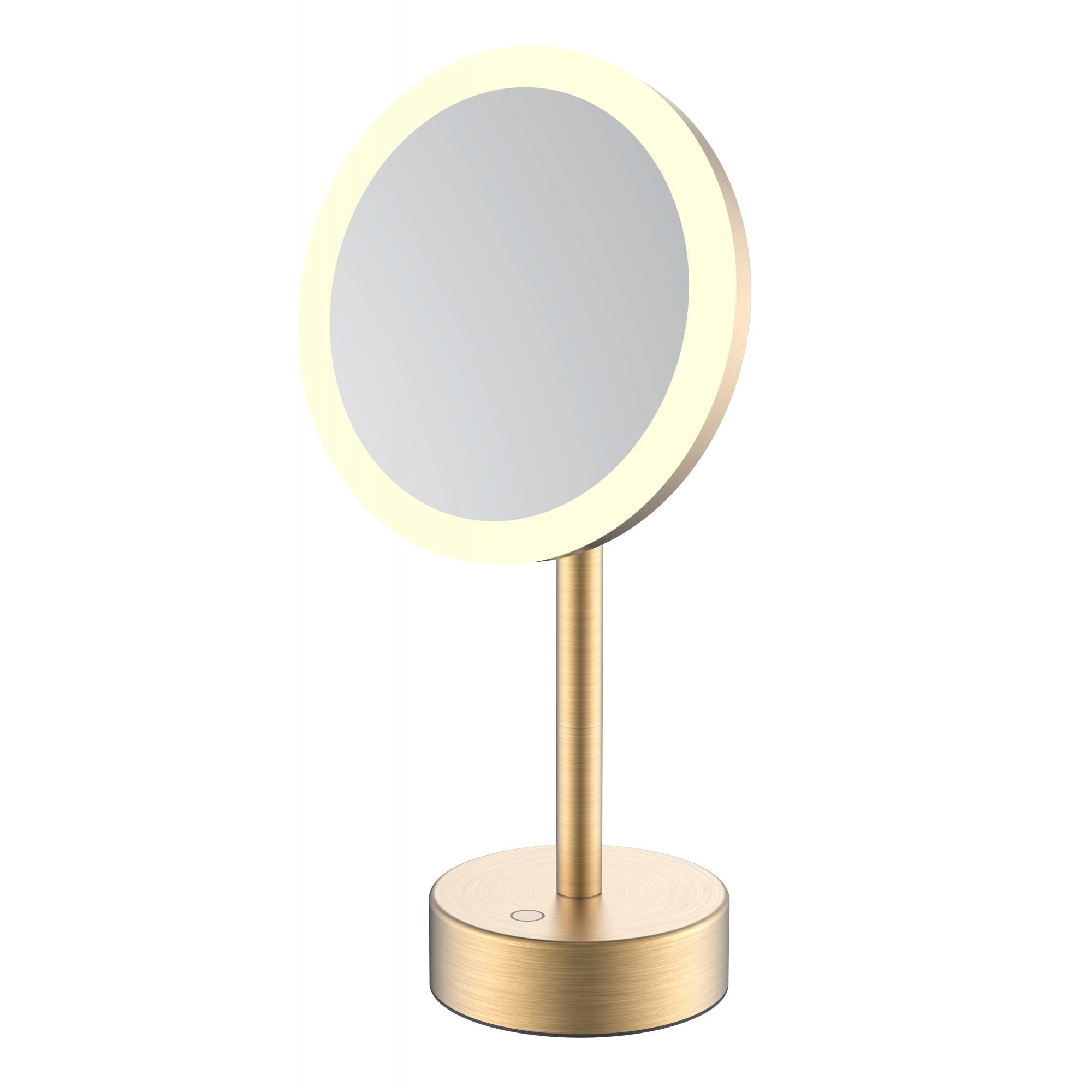 Зеркало настольное с увеличением 5х JAVA S-M551LB, матовое золото. Имеет светодиодную подсветку, сенсорное включение. Идеально для нанесения макияжа, надевания контактных линз, комфортного бритья. Подвижные элементы конструкции позволяют регулировать положение зеркала.